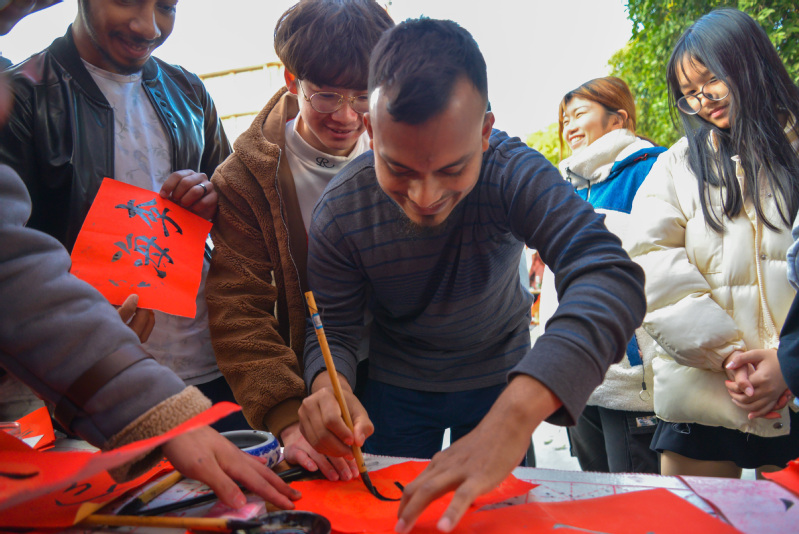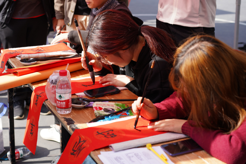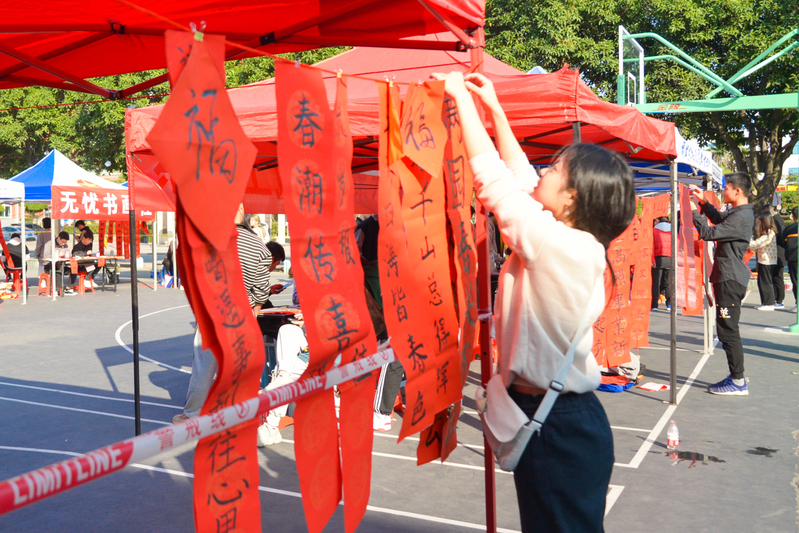 現(xiàn)場(chǎng)院團(tuán)委書法社團(tuán)和各系宣傳部的同學(xué)們揮毫潑墨,灑下新年祝福的話語, 活動(dòng)現(xiàn)場(chǎng)還吸引了我院外國留學(xué)生一同為新年寫下祝福。一幅幅寓意祥瑞的春聯(lián),一個(gè)個(gè)飽含神韻的“?!弊炙偷搅私搪毠ず屯瑢W(xué)們的手中,活動(dòng)現(xiàn)場(chǎng)已然是一片喜慶的紅色海洋。師生一邊欣賞書法技藝,一邊品評(píng)春聯(lián)寓意,都爭(zhēng)先迎“?!被丶?,喜悅之情溢于言表。整個(gè)活動(dòng)現(xiàn)場(chǎng)翰墨的清香與眾人的歡笑,讓濃濃的年味提前灑滿交院。
