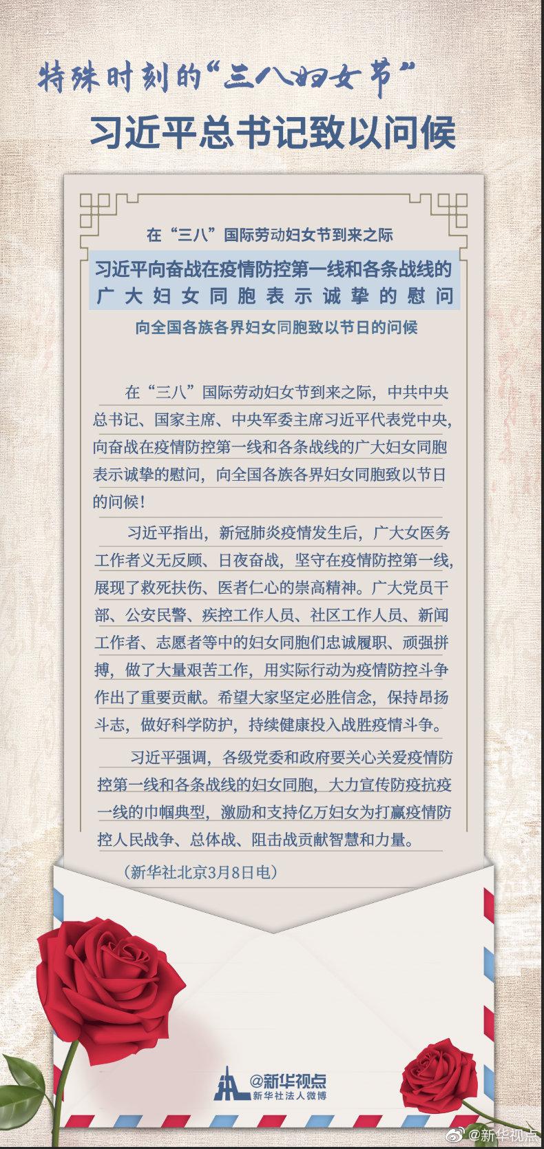習(xí)近平強(qiáng)調(diào),各級(jí)黨委和政府要關(guān)心關(guān)愛(ài)疫情防控第一線和各條戰(zhàn)線的婦女同胞,大力宣傳防疫抗疫一線的巾幗典型,激勵(lì)和支持億萬(wàn)婦女為打贏疫情防控人民戰(zhàn)爭(zhēng)、總體戰(zhàn)、阻擊戰(zhàn)貢獻(xiàn)智慧和力量。