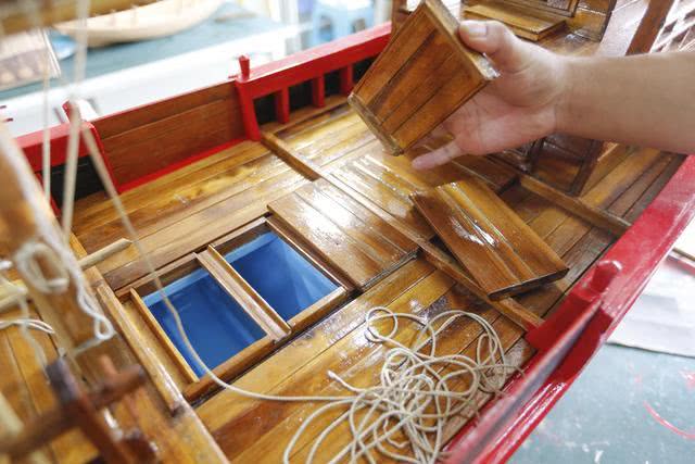 “這是大船縮小到十分之一的樣子,看著小,卻堪比現(xiàn)代的房車,廚房、客廳、臥室、廁所一應(yīng)俱全!”江金春掀開甲板,露出10個隔艙,每個都是獨(dú)立、互不透水的。他說,這是福船的“水密隔艙”建造技藝,已列入聯(lián)合國教科文組織急需保護(hù)的非物質(zhì)文化遺產(chǎn)名錄。