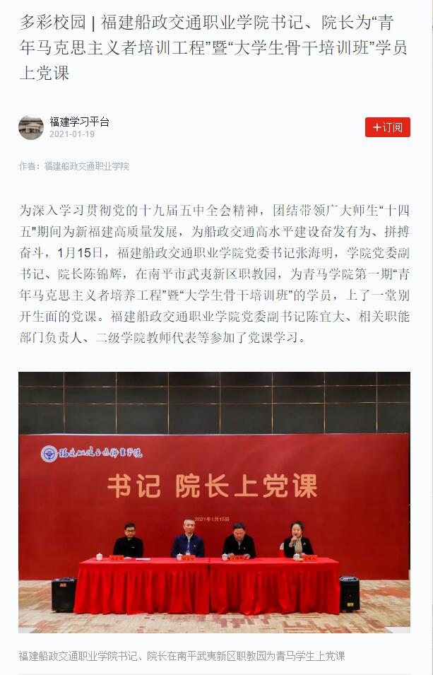 學習強國APP2021.01.19:多彩校園 | 福建船政交通職業(yè)學院書記、院長為“青年馬克思主義者培訓(xùn)工程”暨“大學生骨干培訓(xùn)班”學員上黨課