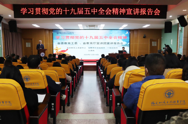 12月14日上午,省委教育工委、省教育廳學習貫徹黨的十九屆五中全會精神宣講報告會在我院北校區(qū)一號樓六樓學術(shù)報告廳舉行。省委教育工委、省教育廳“百人宣講團”成員、省委教育工委副書記,省教育廳黨組成員、一級巡視員王建南作宣講報告。學院在家領(lǐng)導、副科級以上干部、兩級理論學習中心組成員、全院正高級教師、馬克思主義學院教師、全體輔導員、各黨總支委員及支部委員、各民主黨派支部委員、習近平新時代中國特色社會主義思想讀書社、船政青年求是社成員等近360余名師生聆聽了宣講報告。學院黨委書記張海明主持報告會。