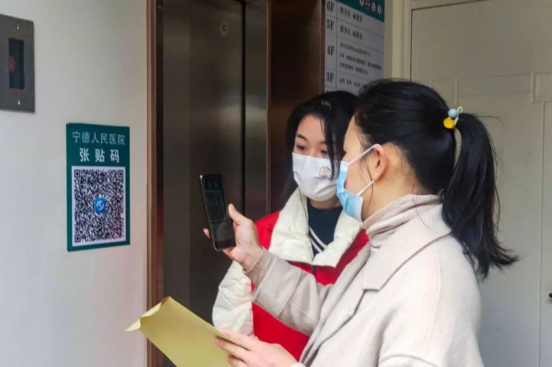 2020級(jí)城市軌道交通運(yùn)營(yíng)管理3班王穎同學(xué)在寧德市人民醫(yī)院引導(dǎo)群眾掃碼登記