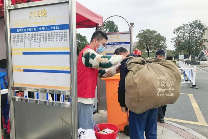 2020級(jí)城市軌道交通工程技術(shù)2班王淵順在角美客運(yùn)總站幫助返鄉(xiāng)群眾搬運(yùn)行李