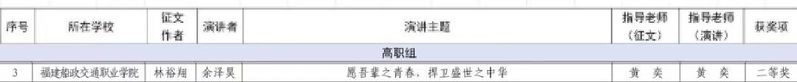 日前,中共福建省委教育工委印發(fā)《關(guān)于公布第六屆“馬克思主義能夠給予我們什么”福建省高校大學(xué)生主題征文和微演講活動獲獎(jiǎng)名單的通知》。經(jīng)高校推薦、專家評審、網(wǎng)上公示等環(huán)節(jié),省委教育工委評選出第六屆“馬克思主義能夠給予我們什么”福建省高校大學(xué)生主題征文和微演講活動獲獎(jiǎng)名單,我校作品《愿吾輩之青春,捍衛(wèi)盛世之中華》(征文作者:林裕翔,演講者:余澤昊,指導(dǎo)教師:黃奕)獲二等獎(jiǎng)。