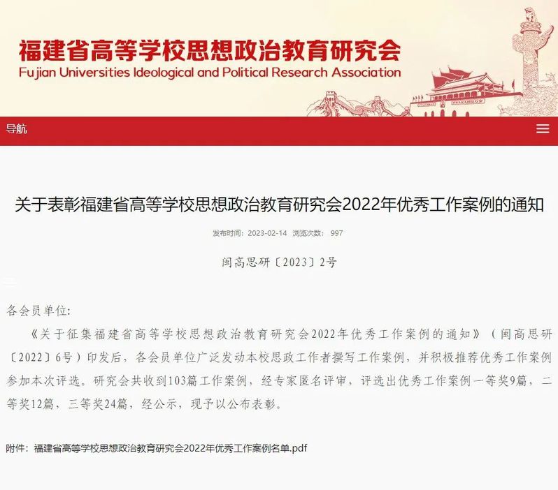 日前,福建省高等學校思想政治教育研究會公布了2022年優(yōu)秀論文和優(yōu)秀工作案例結果,我校獲得優(yōu)秀論文二等獎1項,優(yōu)秀工作案例三等獎1項。
