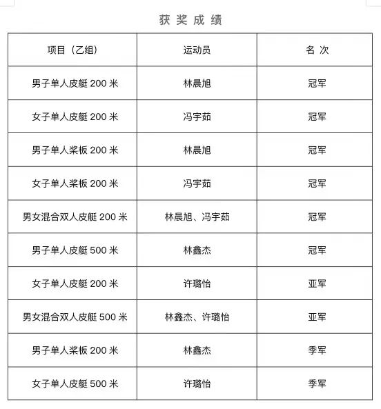 學(xué)院水上運(yùn)動(dòng)隊(duì)首度亮相中國(guó)大學(xué)生皮劃艇錦標(biāo)賽,參加高職高專組(乙組)比賽,隊(duì)員們奮力拼搏,展現(xiàn)出了良好的競(jìng)技狀態(tài),最終獲得6金2銀2銅的佳績(jī)。我校代表隊(duì)代還獲得體育道德風(fēng)尚獎(jiǎng)、林杰獲得優(yōu)秀教練員稱號(hào)、林晨旭獲得優(yōu)秀運(yùn)動(dòng)員稱號(hào)。