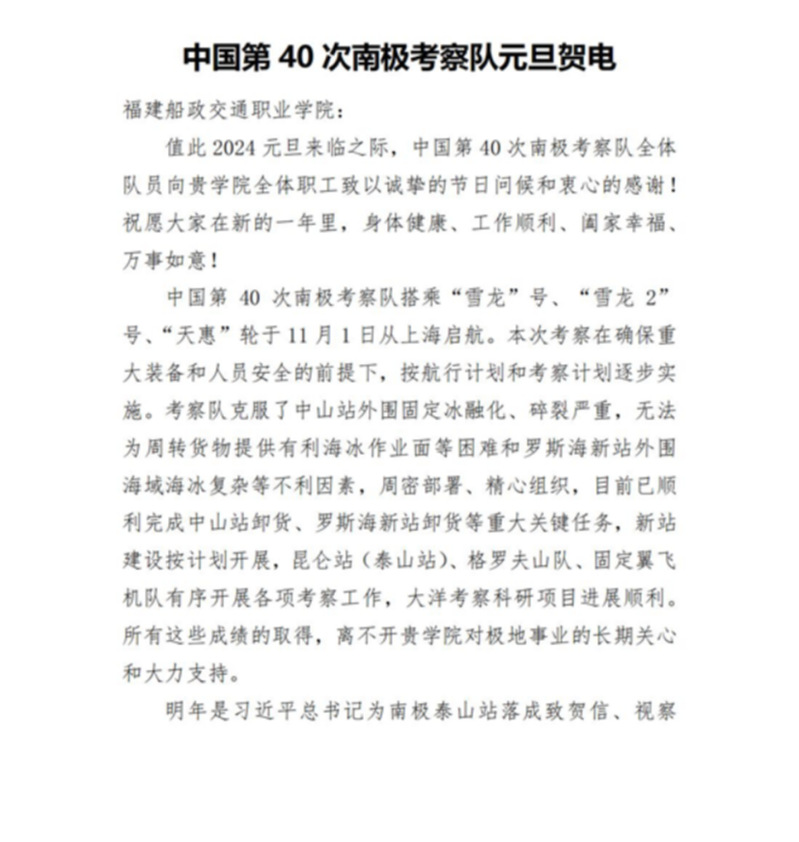 近日,我院收到中國第40次南極科學(xué)考察隊發(fā)來的元旦賀電。遠在南極執(zhí)行考察任務(wù)的中國第40次南極科學(xué)考察隊全體隊員向我院全體職工致以誠摯的節(jié)日問候,向我院對極地事業(yè)的長期支持和大力關(guān)心表示衷心的感謝。