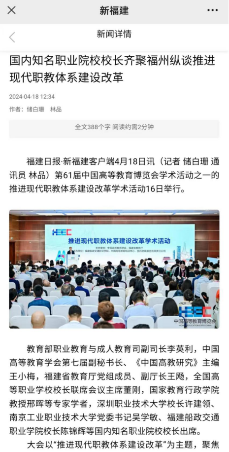 福建日報(bào)·新福建客戶端4月18日訊(記者 儲(chǔ)白珊 通訊員 林品)第61屆中國高等教育博覽會(huì)學(xué)術(shù)活動(dòng)之一的推進(jìn)現(xiàn)代職教體系建設(shè)改革學(xué)術(shù)活動(dòng)16日舉行。