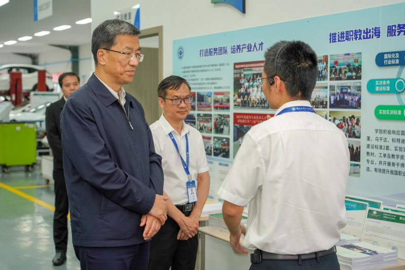 在新能源汽車產(chǎn)教融合示范園,懷進(jìn)鵬部長教師代表親切交流,深入了解校企“七個(gè)共同”共建新能源汽車產(chǎn)教融合示范園的經(jīng)驗(yàn)做法,肯定了學(xué)院積極服務(wù)和融入“一帶一路”倡議、教隨產(chǎn)出,建設(shè)沙特海絲學(xué)院的工作成效。在交通土建智慧檢測(cè)產(chǎn)教融合實(shí)訓(xùn)基地,懷進(jìn)鵬部長重點(diǎn)了解了云課堂的效果,聽取了專業(yè)應(yīng)對(duì)產(chǎn)業(yè)升級(jí)轉(zhuǎn)型的對(duì)策,對(duì)開展技術(shù)服務(wù)給予了肯定。在先進(jìn)艦船模擬器實(shí)訓(xùn)中心,懷進(jìn)鵬部長詳細(xì)了解了人才培養(yǎng)的有關(guān)情況,觀看了心瀾船社學(xué)生非遺手工作品——福船代表趕繒船的模型。在航空實(shí)訓(xùn)基地,懷進(jìn)鵬部長重點(diǎn)了解學(xué)院軍民融合開展產(chǎn)品設(shè)計(jì)研發(fā)的有關(guān)情況,并給予勉勵(lì)。