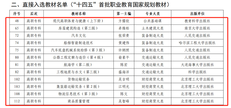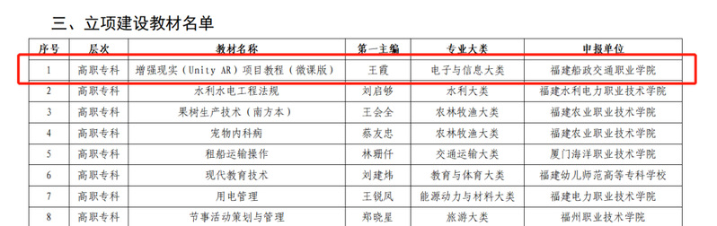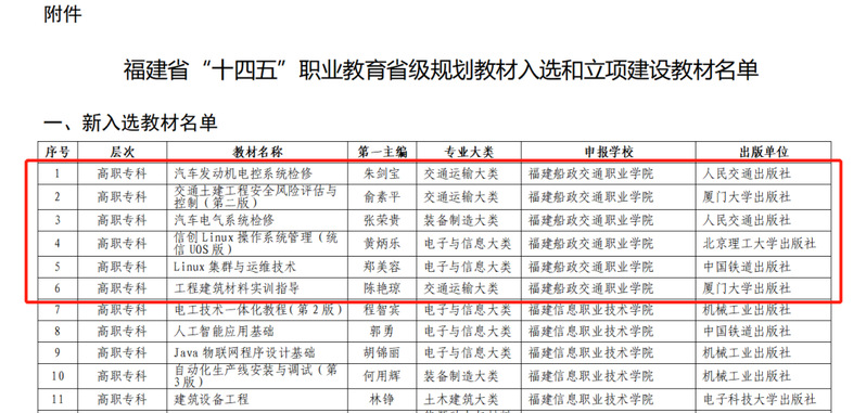 近日,福建省教育廳公布“十四五”職業(yè)教育省級規(guī)劃教材入選和立項建設名單。經(jīng)過單位申報、形式審查、專家評審等嚴格程序,我院19本教材在眾多參評教材中脫穎而出(其中12本“十四五”首批職業(yè)教育國家規(guī)劃教材直接入選)。這是我院在貫徹落實黨中央、國務院對教材建設的決策部署和深化教育教學改革方面取得的重要成果。