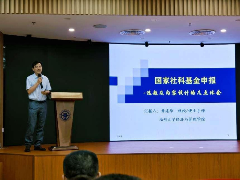 活動邀請了福州大學經(jīng)濟與管理學院黃建華教授作主題講座。黃建華教授是福州大學物流研究院副院長、福建省高層次人才、博士生導師,國家社科基金通訊評審專家,福建省、湖南省、河北省、江西省等省份的自然科學基金項目函評專家;兼任教育部學位中心博士論文、碩士論文評審專家,福建省政府投資項目評審專家、福州市發(fā)改委項目評審專家;福建省應急廳應急管理專家。講座以“國家社科基金申報”為題,為參會的博士教師們作了精彩報告。黃教授圍繞國家社科基金項目的指南走向、選題原則、論證活頁和申報書撰寫技術(shù)細節(jié)等視角展開分享。他強調(diào)雖然國社科從課題指南發(fā)布到提交時間比較短,但中標的課題一定是一個長期思考與積累的結(jié)果。他鼓勵與會教師,將個人學術(shù)研究興趣與國家和社會發(fā)展相融合,積極申報,反復打磨,爭取盡早取得突破。