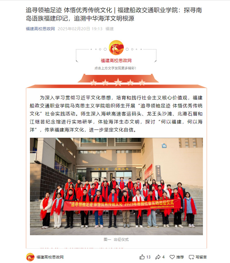 近日,新福建、高校思政網(wǎng)等主流媒體平臺報道我院開展“追尋領(lǐng)袖足跡 體悟優(yōu)秀傳統(tǒng)文化”社會實踐活動。