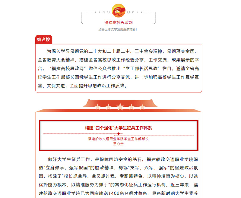 為深入學(xué)習(xí)貫徹黨的二十大和二十屆二中、三中全會(huì)精神,貫徹落實(shí)全國、全省教育大會(huì)精神,搭建全省高校思政工作經(jīng)驗(yàn)分享、工作交流、成果展示的平臺(tái),“福建高校思政網(wǎng)”微信公眾號(hào)推出“學(xué)工部長話思政”欄目,邀請全省高校學(xué)生工作部部長圍繞學(xué)生工作進(jìn)行分享交流,進(jìn)一步加強(qiáng)高校學(xué)生工作互學(xué)互鑒、共促共進(jìn),全面提升思想政治工作質(zhì)效。