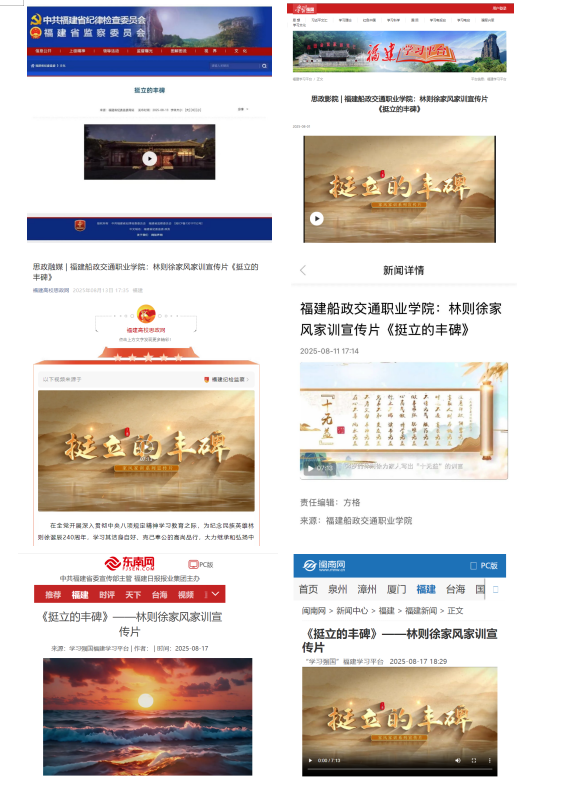 為深入學(xué)習(xí)貫徹習(xí)近平總書(shū)記關(guān)于注重家庭家教家風(fēng)建設(shè)的重要論述,在全黨開(kāi)展深入貫徹中央八項(xiàng)規(guī)定精神學(xué)習(xí)教育之際,由福建省紀(jì)委監(jiān)委駐省教育廳紀(jì)檢監(jiān)察組、林則徐基金會(huì)指導(dǎo),我院紀(jì)委傾力打造的林則徐家風(fēng)家訓(xùn)宣傳片《挺立的豐碑》,被福建省紀(jì)委監(jiān)委網(wǎng)站、學(xué)習(xí)強(qiáng)國(guó)、新福建、福建高校思政網(wǎng)等主流媒體平臺(tái)刊播。