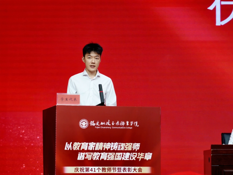 來自安全與環(huán)境學(xué)院24級安全技術(shù)與管理專業(yè)的劉濱福同學(xué),作為學(xué)生代表為全體教師送上真摯祝福,他分享了自己從軍旅到重返校園的心路歷程,感謝老師們的悉心教導(dǎo),并表示將以更加堅定的信念和實際行動回報師恩、不負青春。