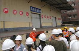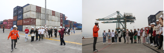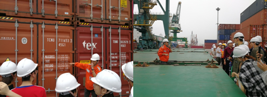 在海盈碼頭工作人員的引導(dǎo)下,同學(xué)們有序進(jìn)入碼頭前沿,由海盈碼頭操作部經(jīng)理助理王勇介紹碼頭的安全注意事項,并利用碼頭的資源,向?qū)W生介紹集裝箱、碼頭構(gòu)造、機(jī)械設(shè)備、艙蓋板和倉庫等方面的知識,也詳細(xì)介紹了集裝箱在碼頭內(nèi)部的整個流轉(zhuǎn)過程。