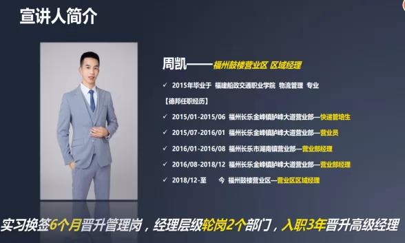 隨后第二個(gè)環(huán)節(jié),德邦福州大區(qū)負(fù)責(zé)人唐文建先生向畢業(yè)生發(fā)出誠(chéng)摯的邀請(qǐng)。德邦的發(fā)展歷程、企業(yè)文化,以及公司培養(yǎng)新人的方式,得到眾多參會(huì)畢業(yè)生的認(rèn)同。