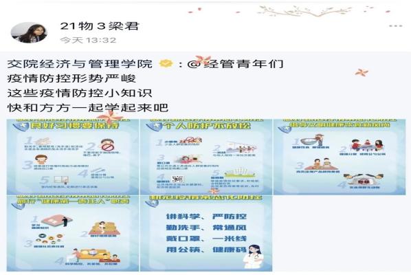 線上、線下進(jìn)行防疫宣傳。突擊隊隊員們深入學(xué)生宿舍,與寢同學(xué)們親切地交談,叮囑他們在校內(nèi)要做好疫情防護(hù)工作,并積極配合學(xué)校和學(xué)院的防疫工作,為疫情防控工作貢獻(xiàn)自己的一份力量。同時隊員們還利用QQ、微信等平臺傳播疫情防護(hù)小知識引導(dǎo)同學(xué)們科學(xué)理性看待疫情。