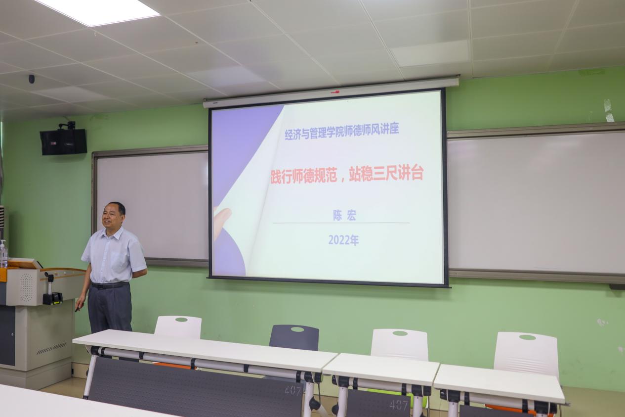 陳宏教授與全體教師們分享了自己多年的教學經(jīng)歷,從“好老師的標準”、“愛是教育的靈魂”、“教育就是鼓勵,教育就是肯定”、“什么是教師的愛”、“教師是學生行動的標桿,德高為師,身正為范”等角度展開,闡述了師德師風建設的重要性、師德師風建設的主要內(nèi)容以及如何進行師德師風建設。他表示,教師對學生的影響是無可替代的,應當用人格魅力征服學生,奉獻愛心,在實踐中不斷提高自己,讓教學更具魅力。講座讓全體教師受益匪淺,觸動很深。陳宏教授勉勵全體教師要恪守職業(yè)道德,規(guī)范從教行為,增強自身的責任感和使命感,做新時代“四有”好老師。
