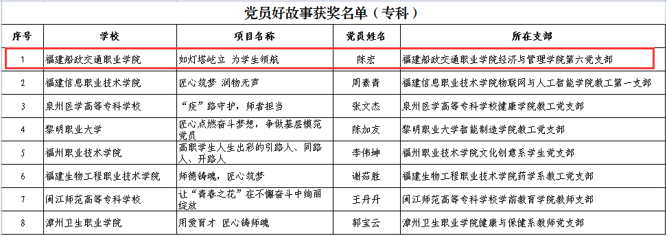 近日,省委教育工委公布了高校黨支部工作“立項活動”優(yōu)秀成果和“黨員好故事、書記好黨課、支部好案例”評選結(jié)果。經(jīng)高校黨委推薦、專家評審,我院第六黨支部陳宏教授《如燈塔屹立 為學生領航》獲評“黨員好故事”。