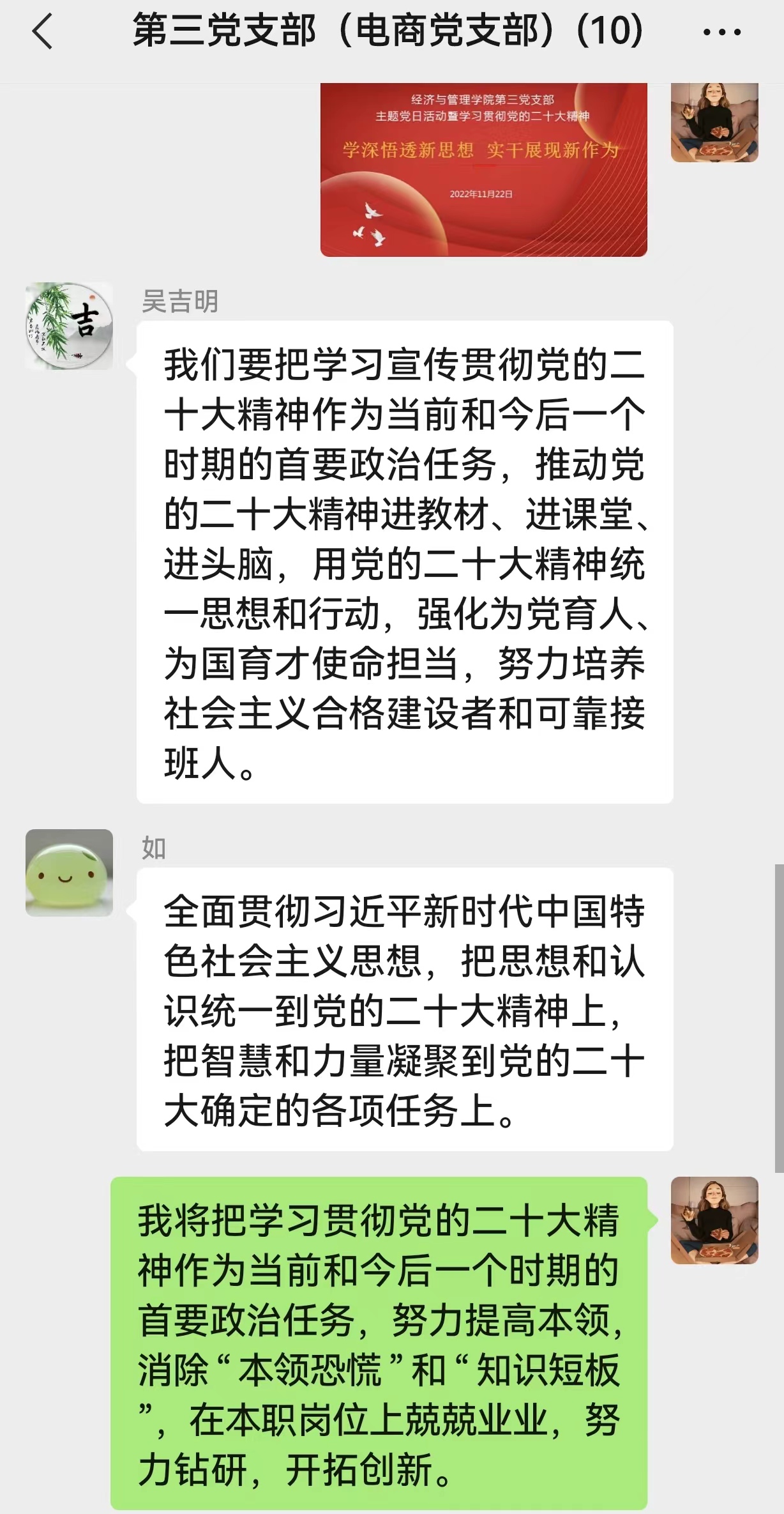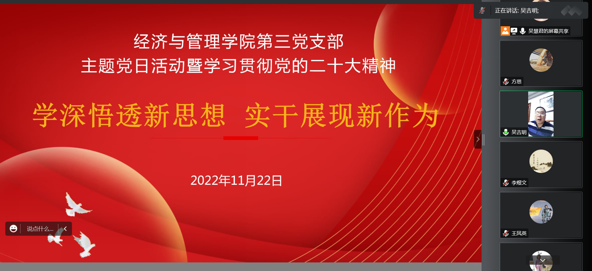 11月22日,經(jīng)濟(jì)與管理學(xué)院第三黨支部采用騰訊會(huì)議的形式開(kāi)展以“學(xué)深悟透新思想實(shí)干展現(xiàn)新作為”為主題的黨日活動(dòng),傳達(dá)學(xué)習(xí)黨的二十大精神。