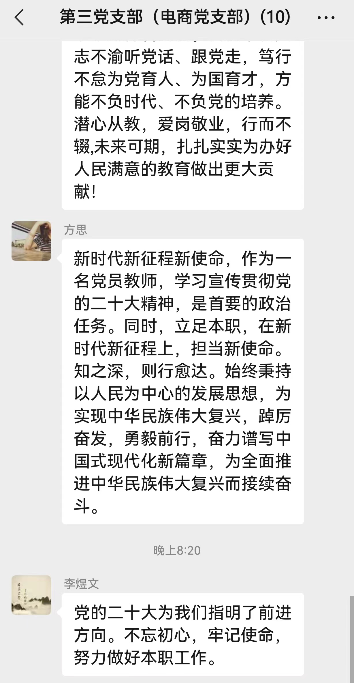 黨的二十大報(bào)告為我們的工作提供了根本遵循和行動(dòng)指引,下一階段,支部黨員將認(rèn)真學(xué)習(xí)貫徹落實(shí)黨的二十大精神,提高政治站位、提升履職能力,在學(xué)思踐悟中堅(jiān)定信心、篤行實(shí)干,把學(xué)習(xí)成效轉(zhuǎn)化為推動(dòng)學(xué)院各項(xiàng)工作高質(zhì)量發(fā)展的新動(dòng)能,高標(biāo)準(zhǔn)高質(zhì)量完成學(xué)院各項(xiàng)工作任務(wù)。