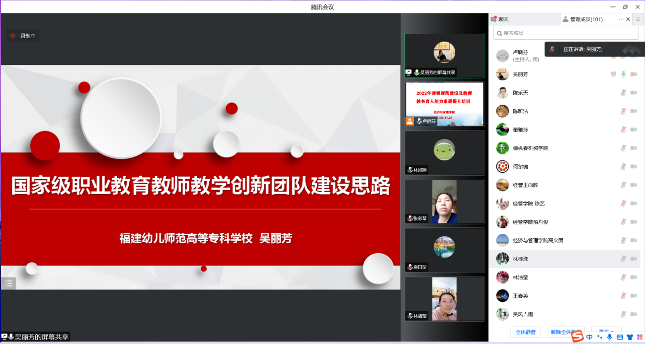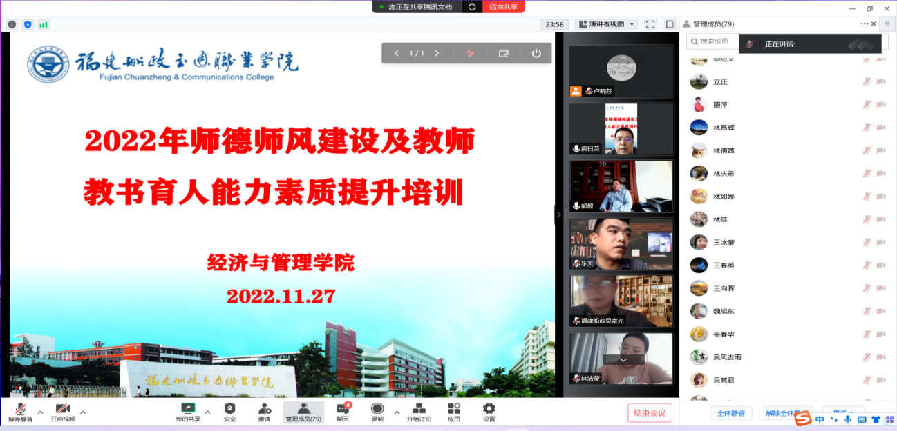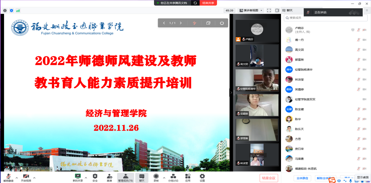 為加強(qiáng)我院教師隊(duì)伍建設(shè),促進(jìn)教師專業(yè)成長(zhǎng),綜合提升我院教師師德修養(yǎng)和能力水平,11月26至27日,我院舉辦2022年師德師風(fēng)建設(shè)及教師教書育人能力素質(zhì)提升培訓(xùn)。邀請(qǐng)了兩位專家教授進(jìn)行授課,吳麗芳教授,福建幼兒師范高等??茖W(xué)校學(xué)前教育學(xué)院院長(zhǎng)、首批國(guó)家級(jí)教學(xué)創(chuàng)新團(tuán)隊(duì)立項(xiàng)建設(shè)單位負(fù)責(zé)人、教育部職業(yè)院校教育類專業(yè)教學(xué)指導(dǎo)委員會(huì)委員,福建省杰出人民教師;熊毅教授,泉州經(jīng)貿(mào)學(xué)院教務(wù)處處長(zhǎng)、福建省名師、福建省教師教學(xué)創(chuàng)新團(tuán)隊(duì)負(fù)責(zé)人。經(jīng)管學(xué)院全體專任教師、實(shí)驗(yàn)員、輔導(dǎo)員及其他學(xué)院老師參加本次培訓(xùn)。因疫情原因,本次培訓(xùn)通過線上形式進(jìn)行,培訓(xùn)由房曰榮院長(zhǎng)主持。