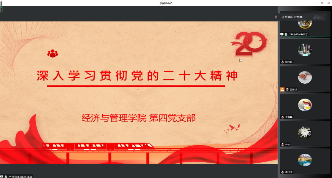 2022年11月25日,由于疫情的影響,經(jīng)濟(jì)與管理學(xué)院第四黨支部以“深入學(xué)習(xí)貫徹黨的二十大精神”為主題,在線上組織學(xué)習(xí)黨的二十大報告。會議由支部書記嚴(yán)敏琳同志主持,支部全體黨員參加了此次學(xué)習(xí)。