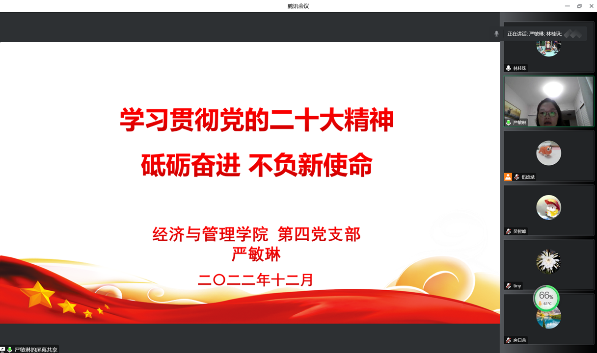 為深入學(xué)習(xí)貫徹黨的二十大精神,12月2日,經(jīng)濟(jì)與管理學(xué)院第四黨支部書記嚴(yán)敏琳同志在線上作題為《學(xué)習(xí)貫徹黨的二十大精神 砥礪奮進(jìn) 不負(fù)新使命》的黨的二十大精神學(xué)習(xí)教育專題黨課。經(jīng)濟(jì)與管理學(xué)院第四黨支部全體黨員參加了此次黨課。
