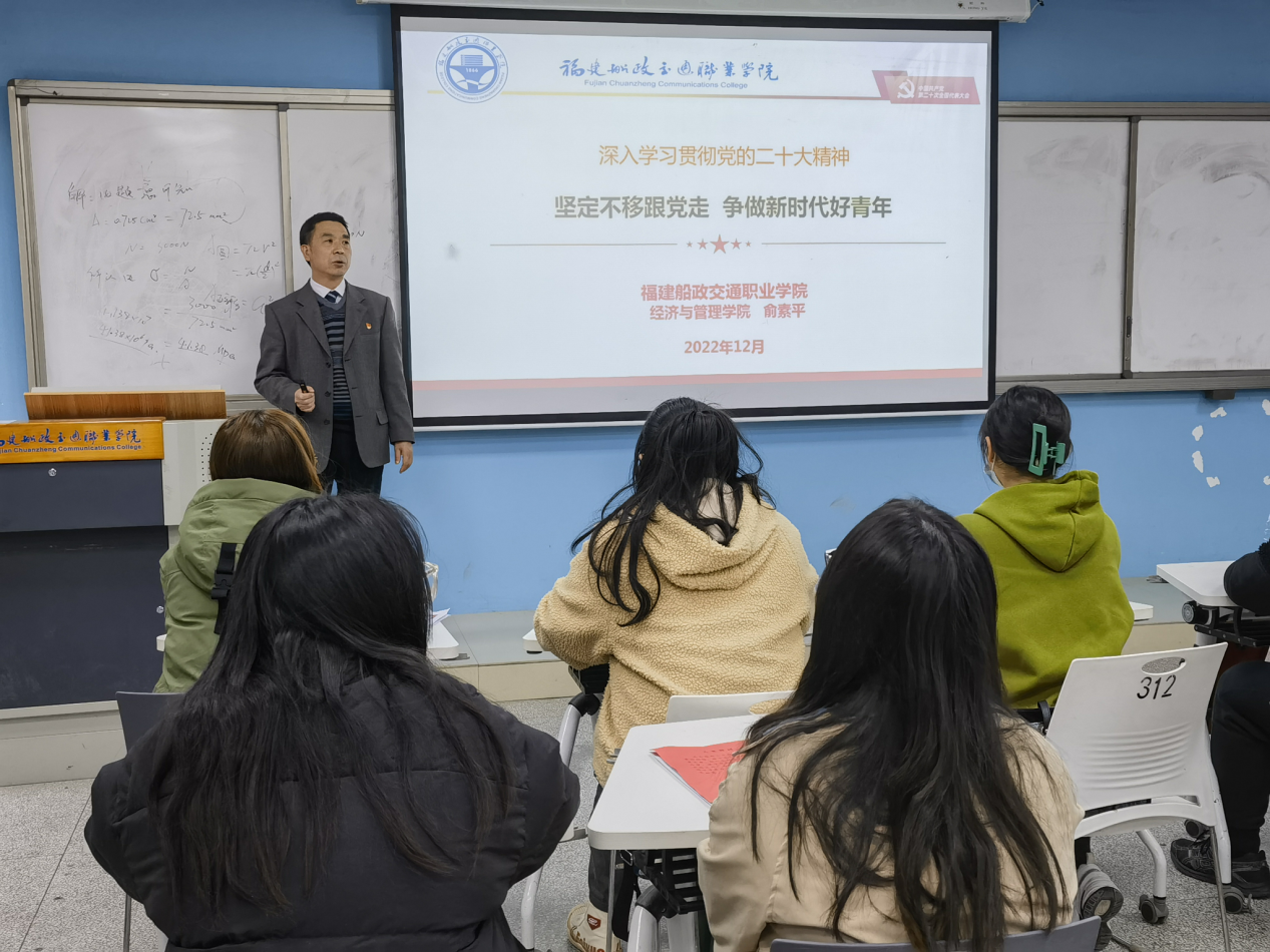 為深入學習宣傳貫徹黨的二十大精神,切實將思想認識行動統(tǒng)一到黨的二十大精神上來,2022年12月14日下午,經(jīng)濟與管理學院黨總支書記俞素平于福船園求實樓207教室開展黨的二十大精神專題宣講會。經(jīng)濟與管理學院第二黨支部學生黨員參加了此次宣講會。