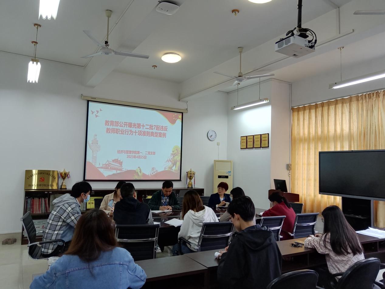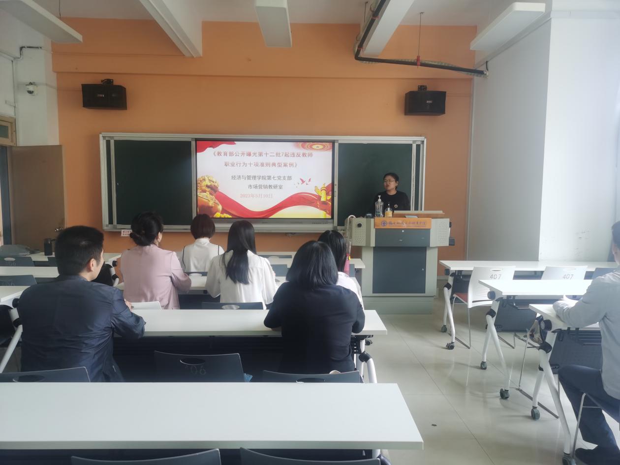 學(xué)高為師,身正為范。為進一步增強我院廣大教職工的紅線意識與底線思維,近期,經(jīng)濟與管理學(xué)院以支部(教研室)為單位,結(jié)合每周一次的師德師風(fēng)學(xué)習(xí),統(tǒng)一安排部署開展了以“教育部公開曝光第十二批7起違反教師職業(yè)行為十項準則典型案例”為主題的師德學(xué)習(xí)活動,通過集中與個人自學(xué)相結(jié)合的學(xué)習(xí)方式,要求全體教師嚴把師德師風(fēng)第一標準,嚴守師德師風(fēng)規(guī)范,嚴格要求自己,加強自身思想政治和師德師風(fēng)建設(shè),將師德師風(fēng)作為評價教師隊伍素質(zhì)的第一標準,對師德違規(guī)問題進行“零容忍”處理。