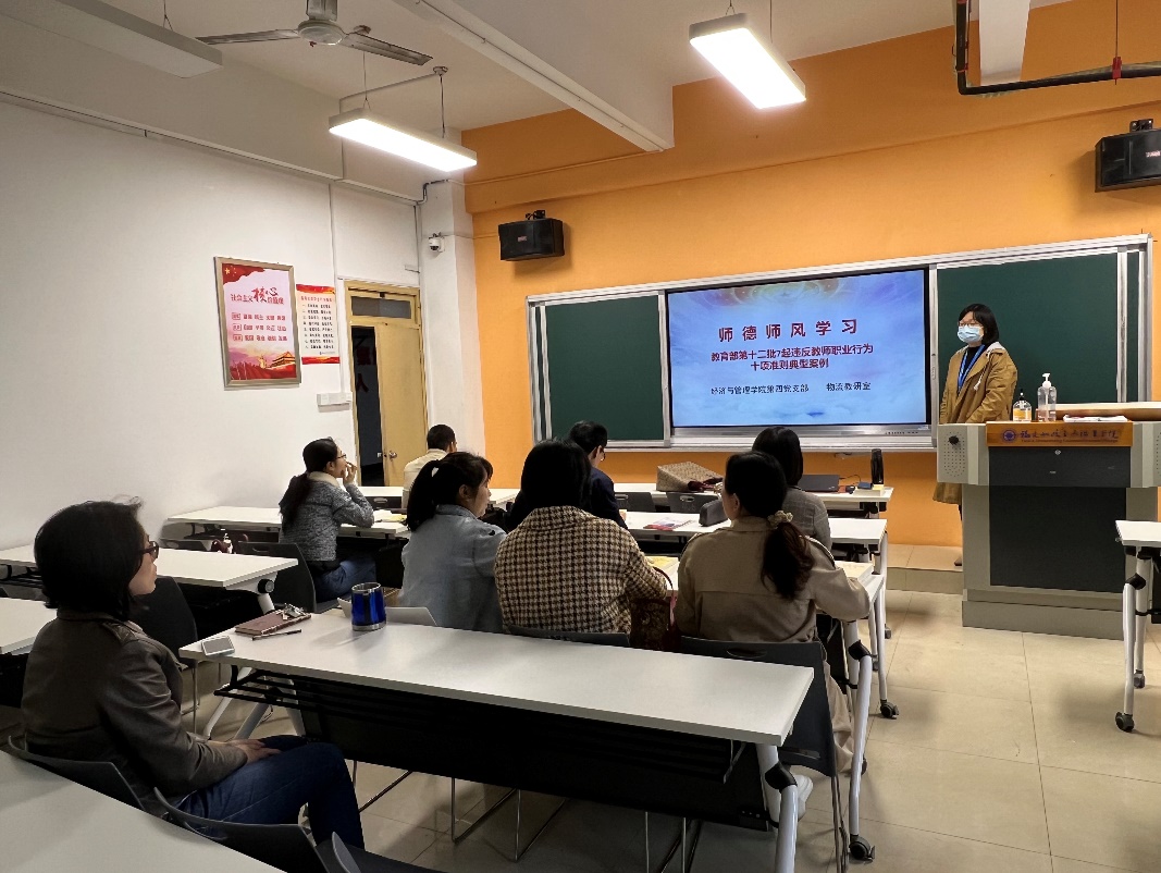 首先,全體教師學(xué)習(xí)了《教育部公開曝光第十二批7起違反教師職業(yè)行為十項準則典型案例》,警示全體教師要嚴格遵守師德規(guī)范,加強自我修養(yǎng),遵紀守法,嚴守底線,以案為戒、以學(xué)促改,切實加強思想自覺和行動自覺,守好師德紅線底線,嚴防師德失范行為發(fā)生,強調(diào)要堅持師德第一標準,堅決杜絕理想信念缺失,育人意識淡漠的情況發(fā)生。要從反面典型案例中汲取教訓(xùn),引以為戒,切實規(guī)范自身行為。隨后,各支部(教研室)結(jié)合各自專業(yè)特色,結(jié)合此次典型案例對十項內(nèi)容進行了重點闡述、心得交流。