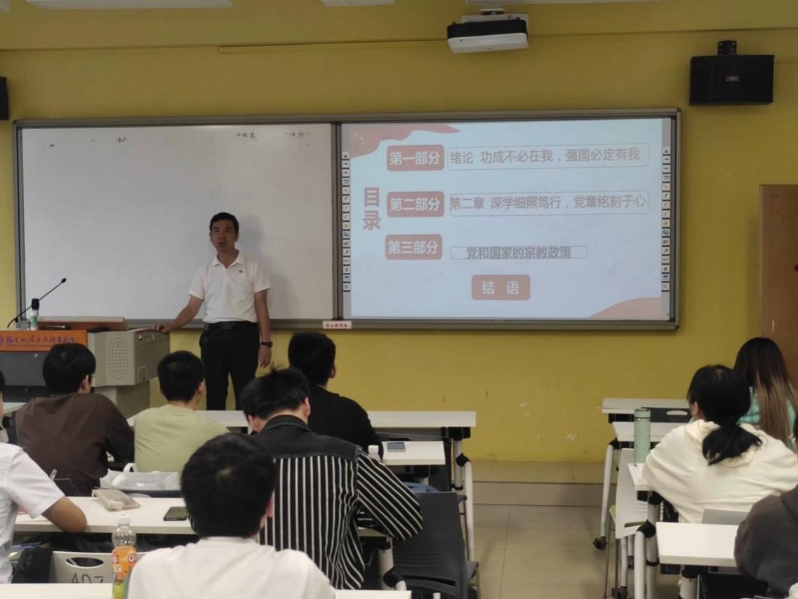 我院黨總支書記俞素平以“功成不必在我,強(qiáng)國(guó)必定有我”為切入點(diǎn),強(qiáng)調(diào)黨章是規(guī)范和指導(dǎo)全黨行為的總章程,同學(xué)們要認(rèn)真學(xué)習(xí)并踐行新黨章,要時(shí)時(shí)以黨章為遵循,深學(xué)細(xì)研其中所蘊(yùn)含的立場(chǎng)觀點(diǎn),多照一照自我,多量一量自身。最后,俞書記希望同學(xué)們要時(shí)刻保持清醒的頭腦,加強(qiáng)思想武裝,正確認(rèn)識(shí)宗教,崇尚科學(xué),為實(shí)現(xiàn)中華民族偉大復(fù)興的中國(guó)夢(mèng)貢獻(xiàn)力量。