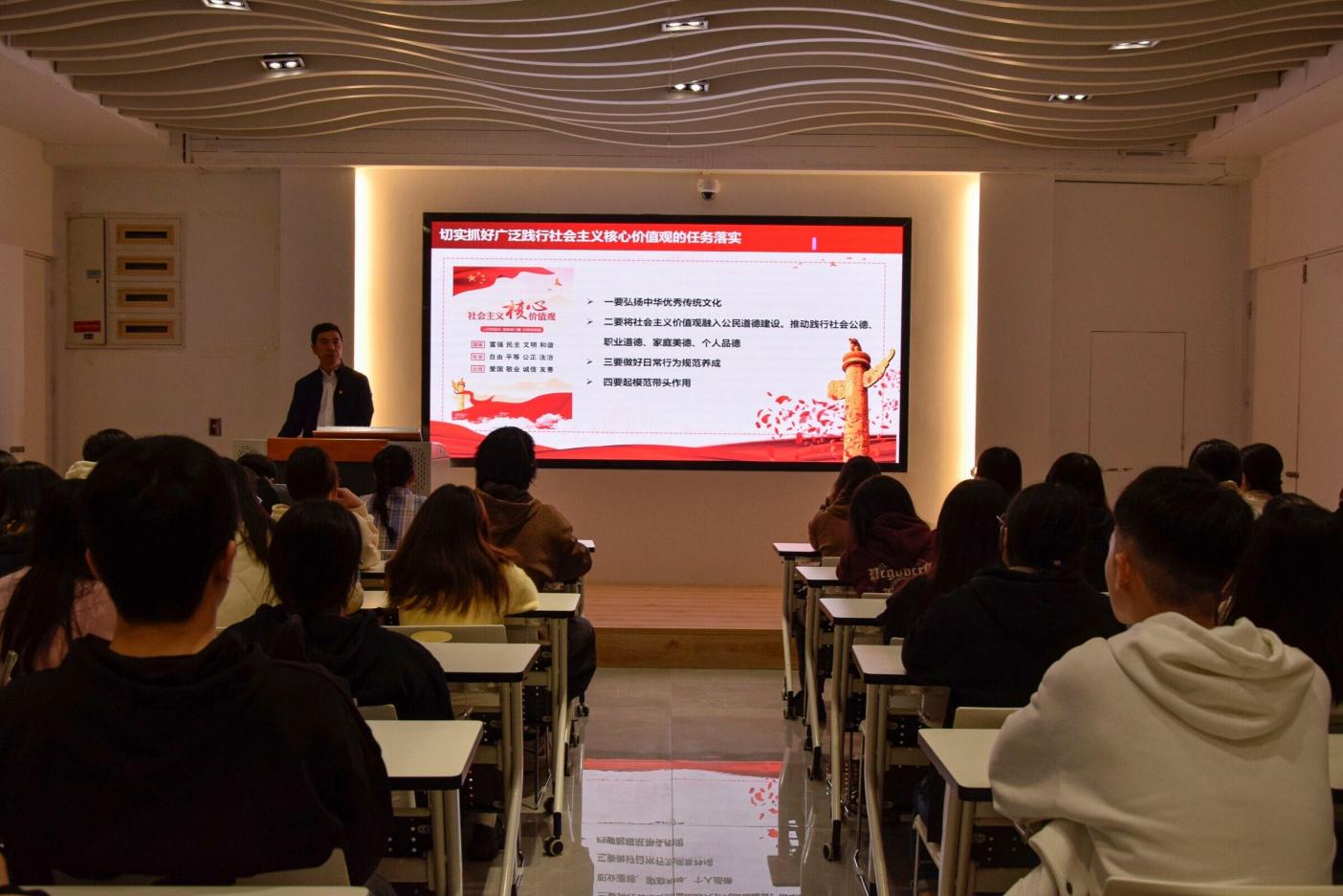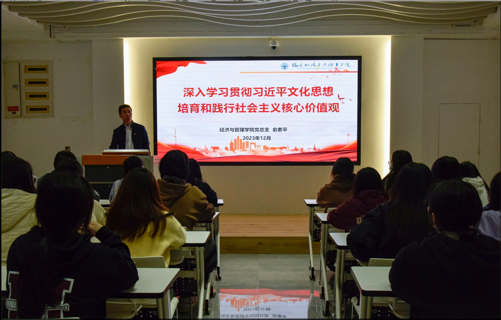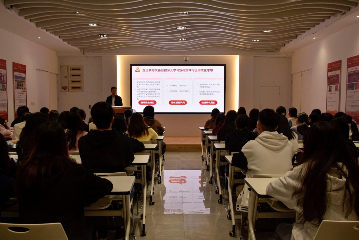 為深入學(xué)習(xí)貫徹黨的二十大精神,推進學(xué)習(xí)貫徹習(xí)近平新時代中國特色社會主義思想主題教育走深走實,12月13日,經(jīng)濟與管理學(xué)院黨總支書記俞素平以《深入學(xué)習(xí)貫徹習(xí)近平文化思想 培育和踐行社會主義核心價值觀》為題,在黨建館開展形勢與政策宣講。經(jīng)濟與管理學(xué)院2022級第三批入黨積極分子參加了此次宣講會。