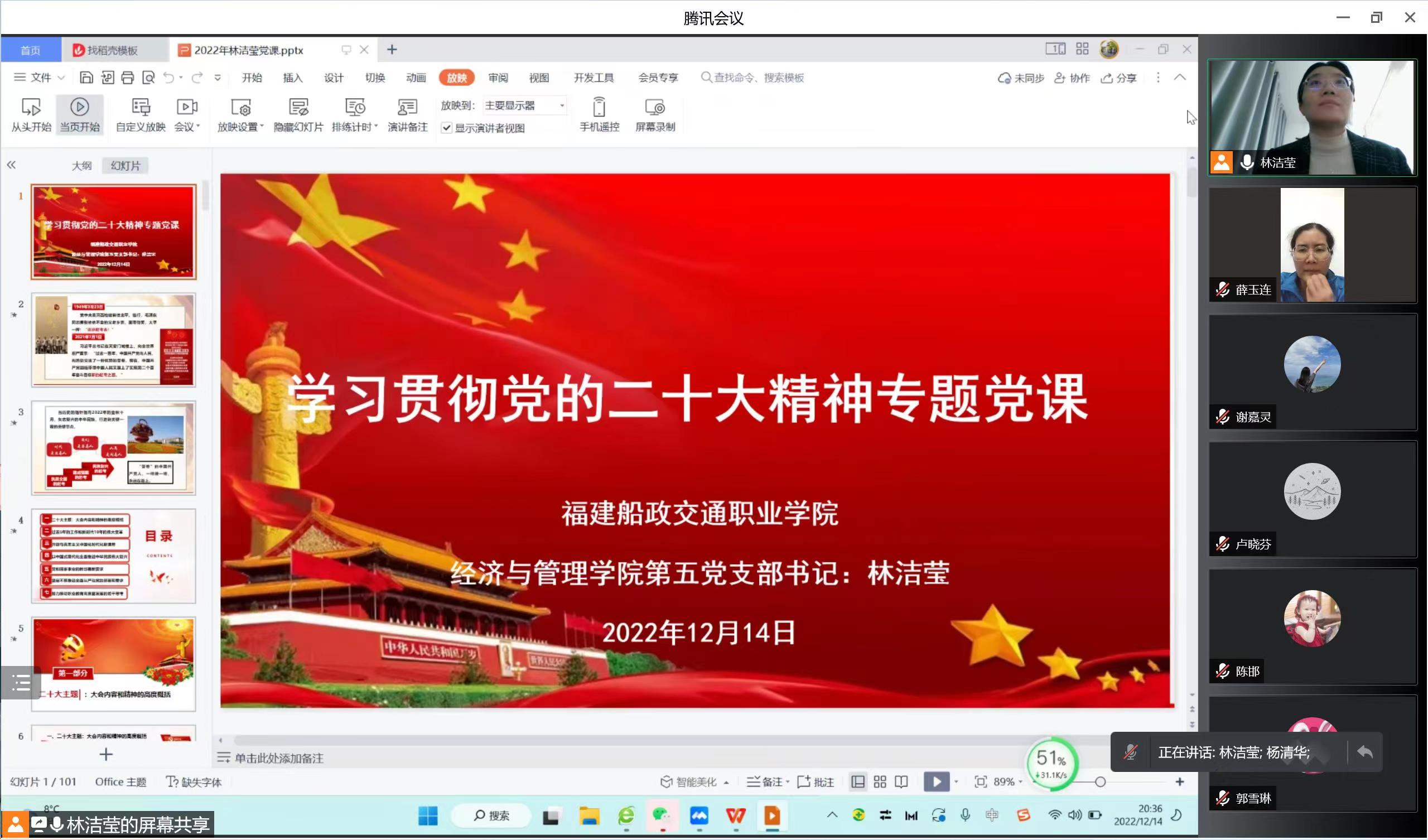 為深入學(xué)習(xí)貫徹黨的二十大精神, 12月14日,經(jīng)濟(jì)與管理學(xué)院第五黨支部書記林潔瑩以《學(xué)習(xí)貫徹黨的二十大精神》為題,通過“支部書記上黨課”的形式進(jìn)行黨的二十大精神專題宣講,第五黨支部全體黨員教師通過線上形式參加此次會議。