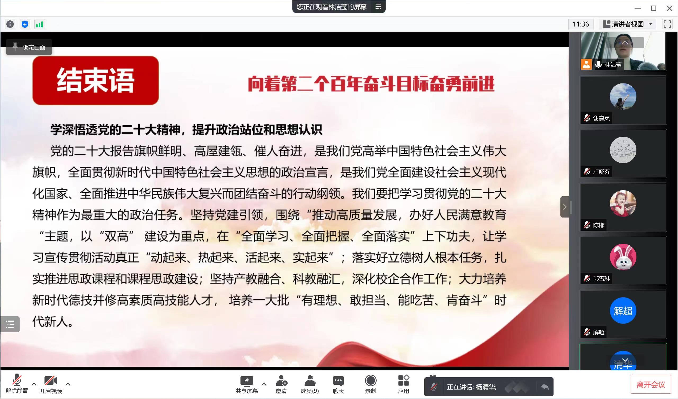此次專題宣講,圍繞黨的二十大鮮明主題、重大意義、報告的15個方面內(nèi)容進(jìn)行解讀,聚焦新論述新論斷,重點(diǎn)對黨的二十大報告的“關(guān)鍵詞”進(jìn)行了詳細(xì)闡釋。講授過程緊密結(jié)合國內(nèi)外形勢,穿插個人深入思考和現(xiàn)實(shí)案例,深入淺出,主旨鮮明地揭示了報告精髓和要義。黨課最后,林潔瑩同志強(qiáng)調(diào),全體師生要把學(xué)習(xí)貫徹黨的二十大精神作為當(dāng)前和今后一個時期的首要政治任務(wù),在全面學(xué)習(xí)、全面把握、全面落實(shí)上下功夫,學(xué)深悟透,準(zhǔn)確學(xué)習(xí)把握黨的二十大精神核心要義和豐富內(nèi)涵,把學(xué)習(xí)貫徹黨的二十大精神和學(xué)院重點(diǎn)工作結(jié)合起來,以黨的二十大精神為引領(lǐng),立足本職工作,堅守培養(yǎng)社會主義建設(shè)者和接班人的育人本色,在新時代新征程上為學(xué)院轉(zhuǎn)型發(fā)展作出新的貢獻(xiàn)!