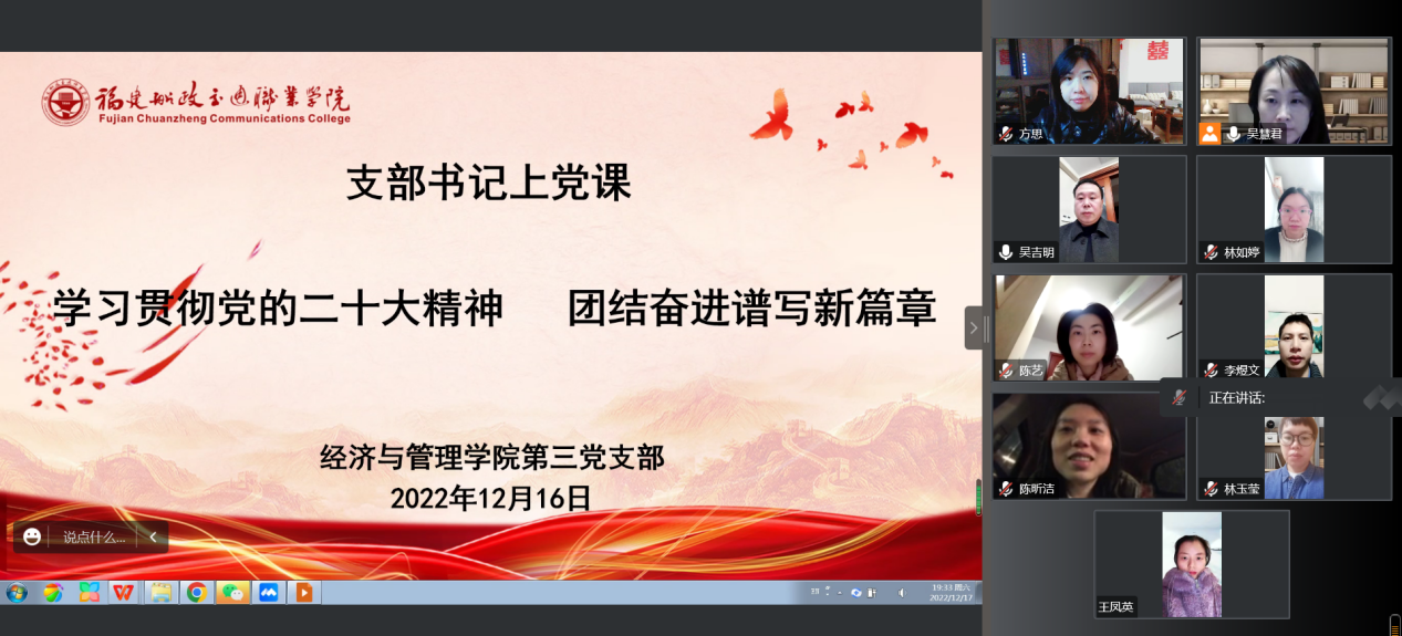 為增強(qiáng)學(xué)習(xí)宣傳貫徹黨的二十大精神的政治自覺、思想自覺、行動自覺,切實推動學(xué)習(xí)成果轉(zhuǎn)化為推進(jìn)學(xué)院各項工作高質(zhì)量發(fā)展的實際成效,2022年12月16日,經(jīng)濟(jì)與管理學(xué)院第三黨支部書記吳吉明以《學(xué)習(xí)貫徹黨的二十大精神,團(tuán)結(jié)奮進(jìn)譜寫新篇章》為題開展黨的二十大精神專題宣講,第三黨支部全體黨員參加了此次宣講。