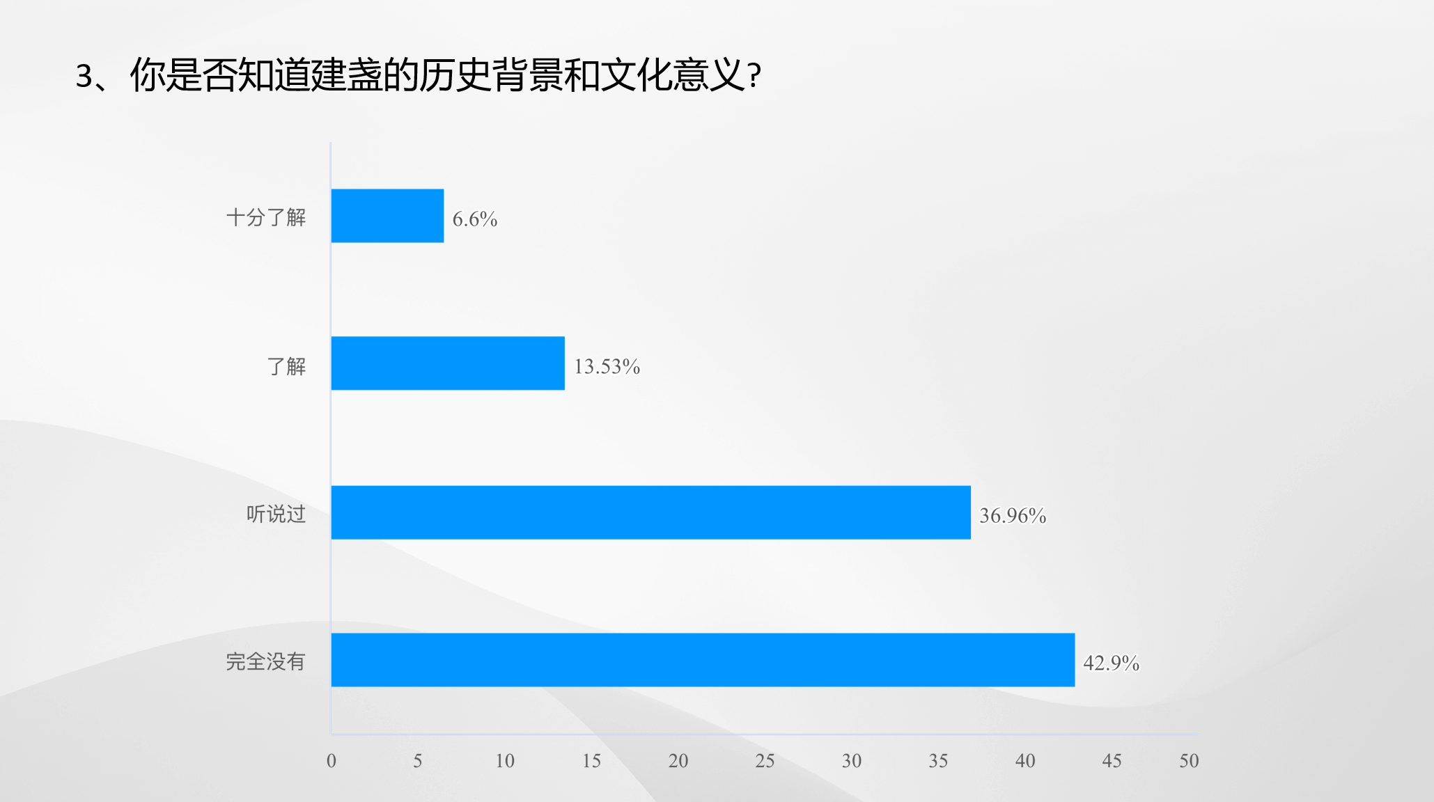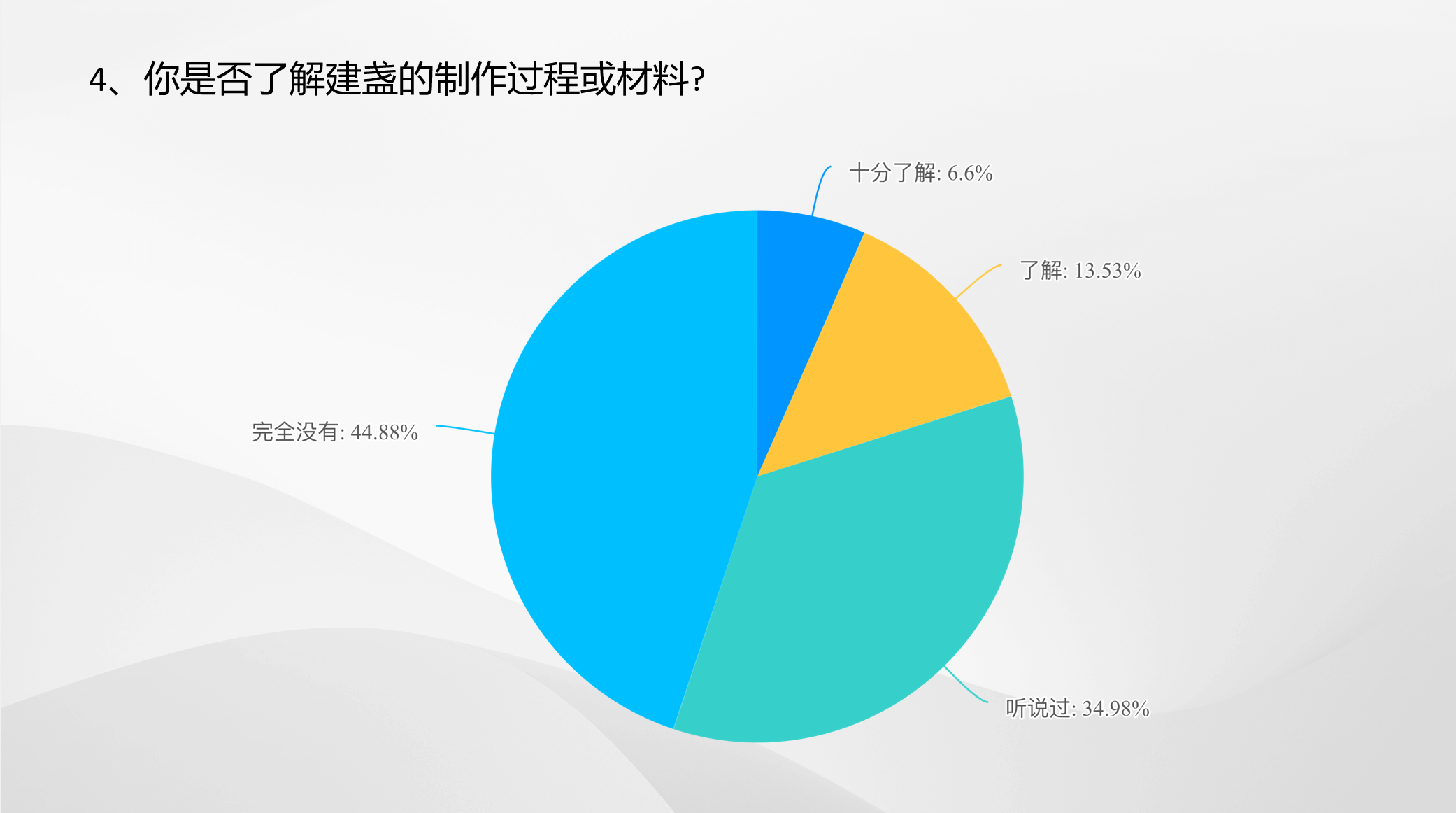 調(diào)研前期,實踐隊通過問卷調(diào)查,研究我院學(xué)生對于建盞的了解情況。調(diào)查結(jié)果顯示,大部分學(xué)生對建盞在歷史背景、文化內(nèi)涵和制作工藝等方面的了解較為有限?;谡{(diào)查結(jié)果,學(xué)生們進(jìn)一步明確了此次調(diào)研的目的和方向。