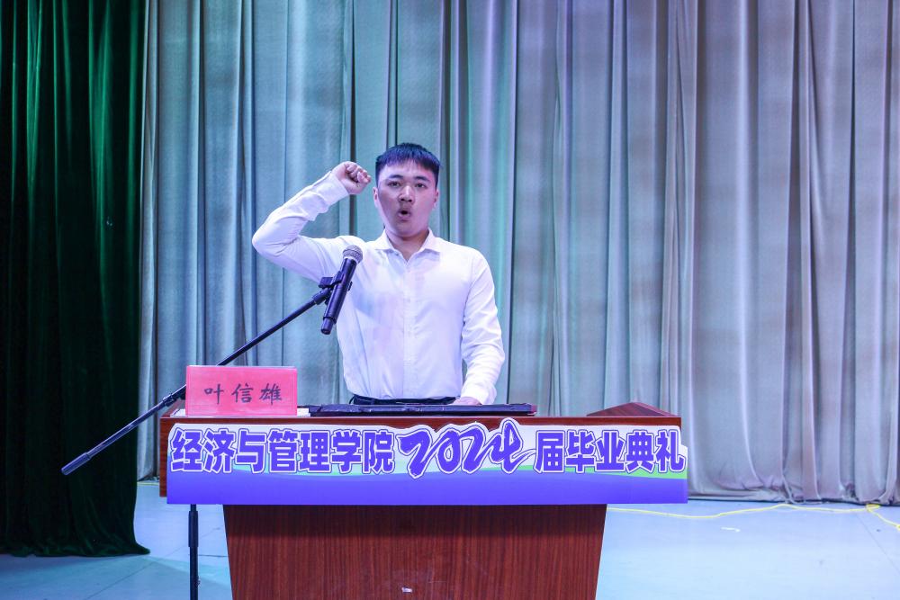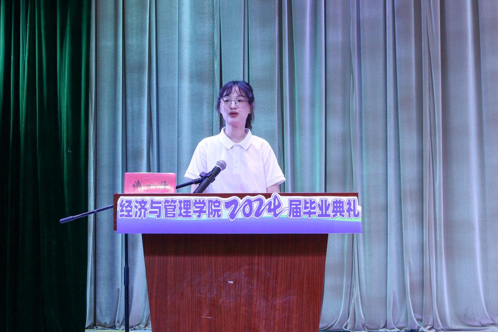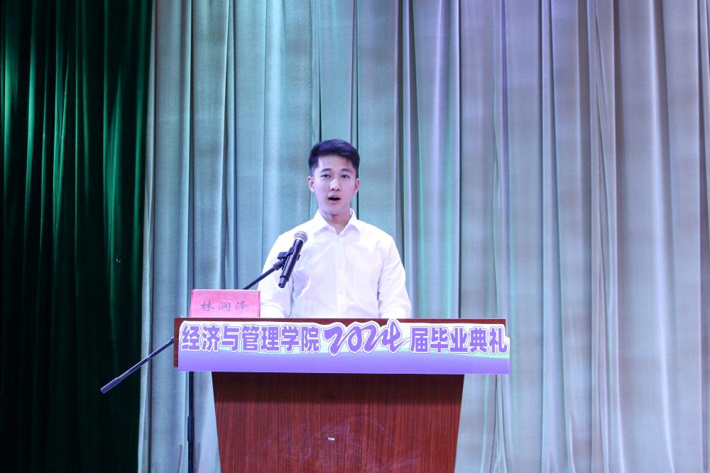 畢業(yè)生代表林潤澤感懷了在經(jīng)管學(xué)院三年的學(xué)習(xí)和生活經(jīng)歷,從相聚于此到如今奔赴五湖四海,他表達了同學(xué)間惺惺相惜的不舍,對老師們諄諄教誨的感激以及對學(xué)院的深深眷戀之情;同時,他分享了自身的學(xué)習(xí)經(jīng)歷以及對未來的展望,表示將在未來的道路上,不斷追求卓越,提升自我價值,并鼓勵同學(xué)們要積極面對未來的挑戰(zhàn),不斷提升自己的能力,堅定信念,勇往直前,用智慧和勇氣書寫新的時代篇章。