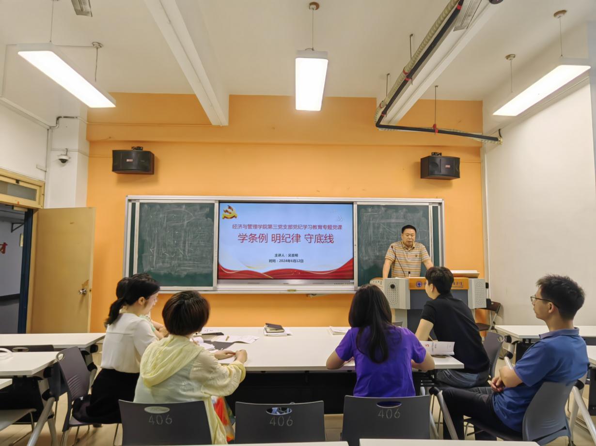 為扎實(shí)開(kāi)展黨紀(jì)學(xué)習(xí)教育,引導(dǎo)黨員教師們學(xué)紀(jì)、知紀(jì)、明紀(jì)、守紀(jì),2024年6月12日,經(jīng)濟(jì)與管理學(xué)院第三黨支部書記吳吉明以“學(xué)條例 明紀(jì)律 守底線”為題為三支部全體黨員講授黨紀(jì)學(xué)習(xí)教育專題黨課。