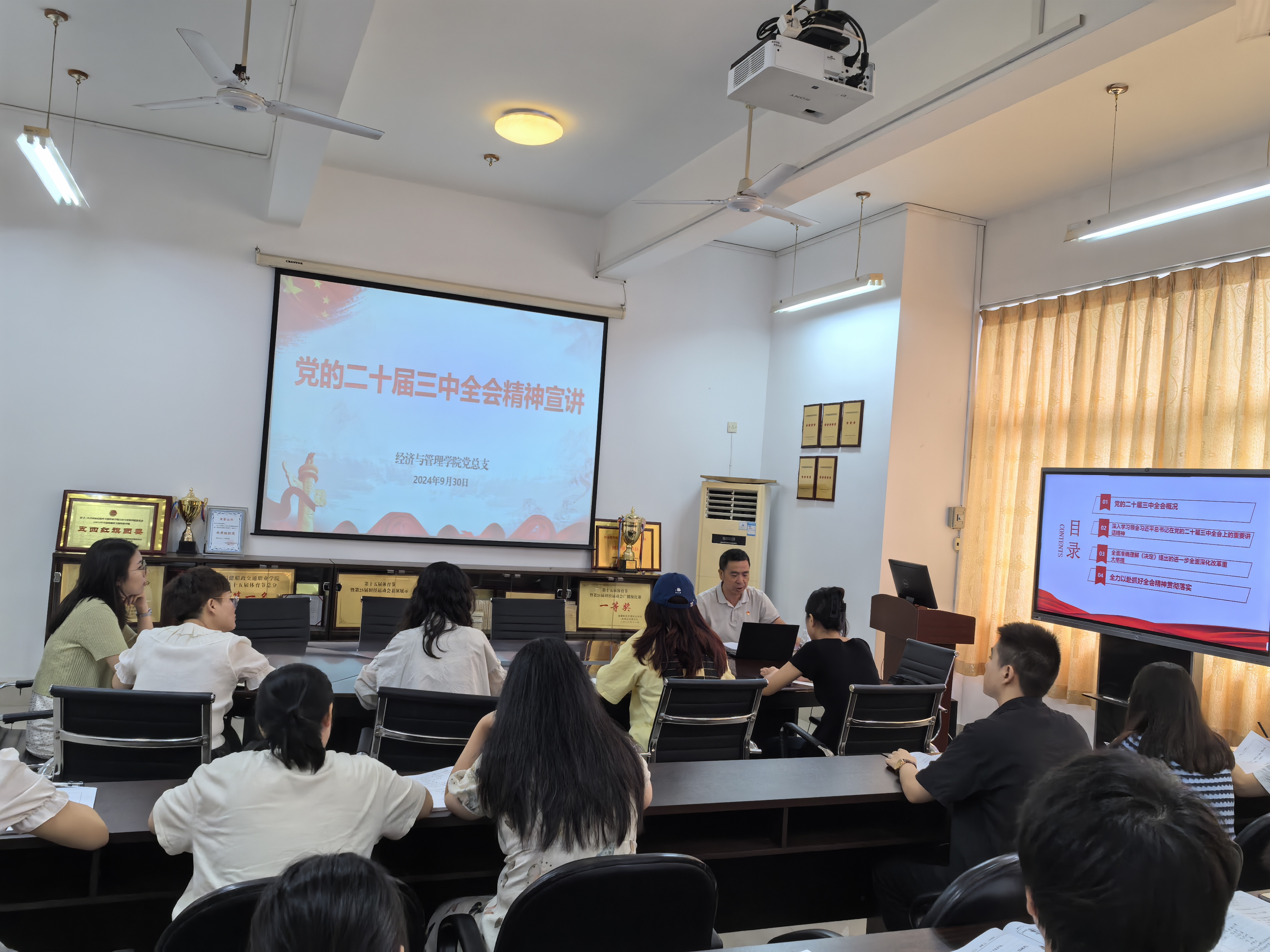 為深入學(xué)習(xí)貫徹黨的二十屆三中全會精神,引導(dǎo)黨員師生準(zhǔn)確把握全會精神的實(shí)質(zhì)和豐富內(nèi)涵,筑牢思想根基、強(qiáng)化理論武裝,把思想行動統(tǒng)一到全會精神上來,把黨中央部署轉(zhuǎn)化為推動學(xué)院高質(zhì)量發(fā)展的強(qiáng)大力量,9月30日,經(jīng)濟(jì)與管理學(xué)院黨總支書記俞素平同志為經(jīng)濟(jì)與管理學(xué)院第一、二黨支部黨員師生講授了一場精彩的專題黨課。