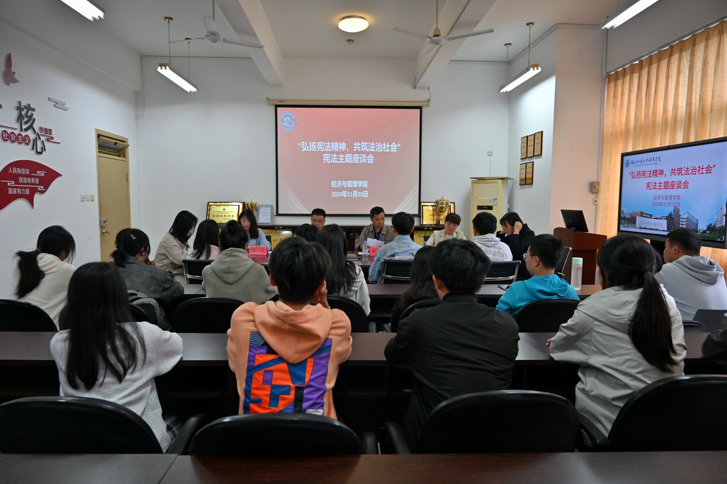 為深入貫徹習(xí)近平法治思想,經(jīng)濟(jì)與管理學(xué)院于2024年11月20日成功舉辦了“弘揚(yáng)憲法精神,共筑法治社會”憲法主題座談會。黨總支書記俞素平、院長房曰榮、黨總支副書記林麗萍、團(tuán)委書記傅一丹及江瀟、王春英老師出席了本次活動。