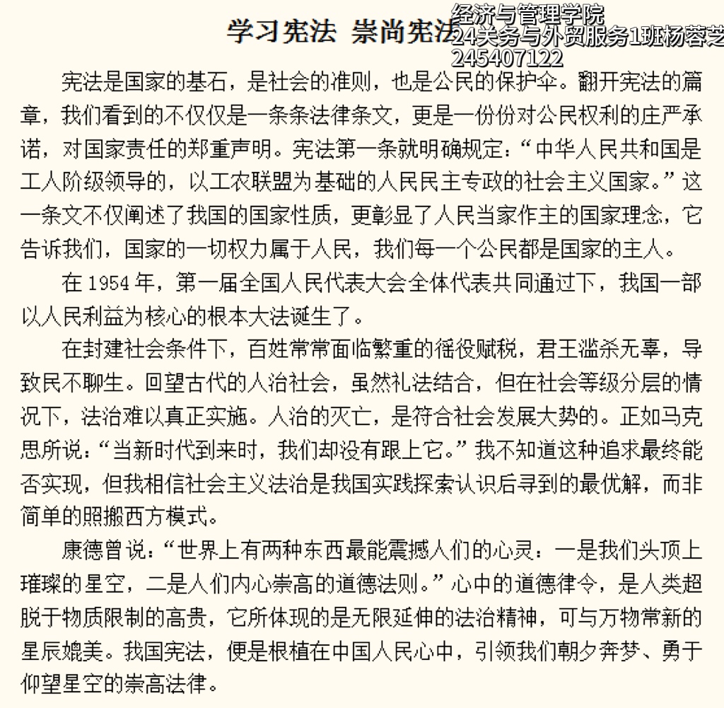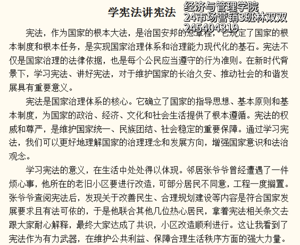 在主題征文環(huán)節(jié)中,同學(xué)們紛紛以筆為媒,或結(jié)合親身經(jīng)歷,或引用經(jīng)典案例,生動(dòng)展現(xiàn)了憲法在保障公民權(quán)利和維護(hù)社會(huì)秩序中的重要作用。這些作品彰顯了同學(xué)們對(duì)法治社會(huì)的深入思考和對(duì)法律價(jià)值的獨(dú)到見(jiàn)解。