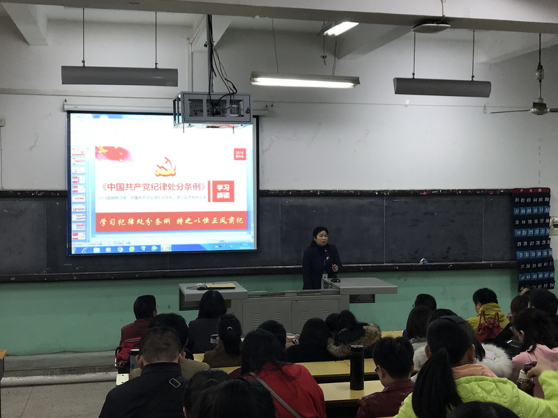 張輝書記介紹了《條例》修訂的歷程、背景、亮點(diǎn)、要點(diǎn),并結(jié)合學(xué)院工作實(shí)際及十八大以來中紀(jì)委、省紀(jì)委通報(bào)的違紀(jì)違規(guī)典型案例,重點(diǎn)對新增、修訂的條款逐條作了解讀。通過宣講、解讀,讓廣大黨員干部進(jìn)一步牢固樹立“四個(gè)意識”和法紀(jì)意識、規(guī)矩意識,增強(qiáng)了行動(dòng)自覺。