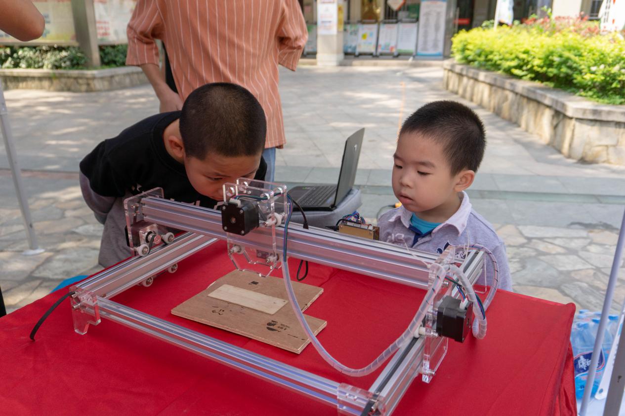 在蘭亭新天地社區(qū)廣場活動現(xiàn)場,機(jī)械系機(jī)器人協(xié)會的同學(xué)們向群眾展示了“機(jī)器人對抗小車”和“激光打印雕刻機(jī)”。同學(xué)們向現(xiàn)場的群眾和小朋友們現(xiàn)場演示、生動講解了“機(jī)器人對抗小車”和“激光打印雕刻機(jī)”的基本原理和操作方法;并與觀眾互動,回答他們提出的問題,耐心詳細(xì)解答了為何機(jī)器人小車能夠在桌面行駛而不掉落、激光雕刻機(jī)如何識別圖像等問題。在社區(qū)活動現(xiàn)場,觀眾群體主要以中小學(xué)生和老年人為主,對于中小學(xué)生來說,有著強(qiáng)烈的求知欲,酷炫的科技展示和生動的知識普及講解能夠很快吸引他們的注意力。而老年人則主要表達(dá)出對現(xiàn)今社會的新興科技強(qiáng)烈的興趣,感嘆于社會的進(jìn)步和科技的發(fā)展,并表示對于此次的職業(yè)教育進(jìn)社區(qū)活動十分的滿意。