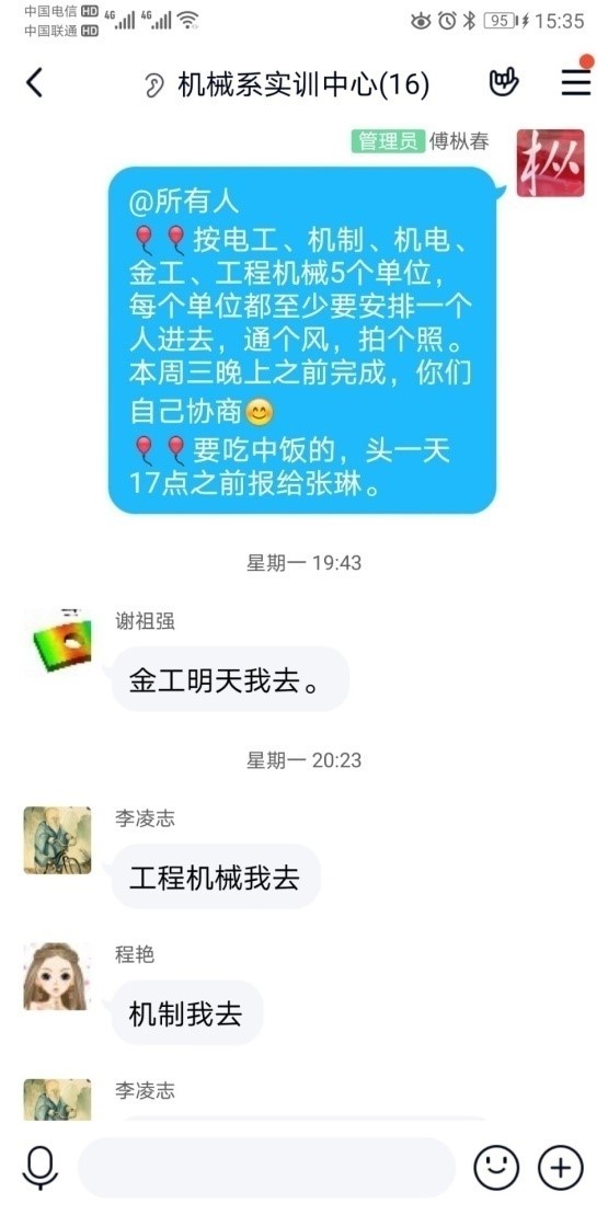 疫情發(fā)生后,機械工程系迅速成立防控新冠肺炎疫情工作領(lǐng)導(dǎo)小組,實訓(xùn)中心傅樅春主任、李凌志副主任作為小組成員投入?yún)f(xié)調(diào)宣傳組、防控保障組、學(xué)生工作組、教職工工作組等各個分組的工作中。參與系部組織的歷次新冠疫情防控工作會議,及時向老師傳達新型冠狀病毒感染的肺炎防控知識,提高自我保護能力。系實訓(xùn)中心有三分之二的老師同時兼任學(xué)生班主任,他們落實落細學(xué)生健康管理措施,健全完善“網(wǎng)格化”“單元化”“人盯人”跟蹤管理臺賬,及時聯(lián)絡(luò)學(xué)生,全面準確掌握學(xué)生健康狀況和動態(tài),重點關(guān)注學(xué)生是否有發(fā)熱、疑似或感染疫情情況,督促檢查學(xué)生按時在Welink健康打卡,關(guān)注學(xué)生的心理動態(tài),并對學(xué)生進行適當安撫、心理咨詢和輔導(dǎo)。