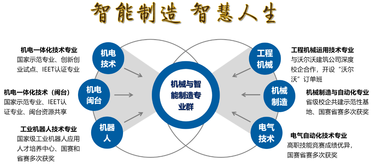 機械與智能制造專業(yè)群主要由機電一體化技術、工業(yè)機器人技術、電氣自動化技術、機械制造與自動化技術和工程機械運用技術等5個專業(yè)組成。面向先進制造業(yè)的數(shù)字化設計、智能化生產(chǎn)、智慧化服務、工程機械運用等領域用人單位,以立德樹人為根本,突出工業(yè)產(chǎn)品生命全周期管理意識;培養(yǎng)具備數(shù)字化設計,智能制造,生產(chǎn)質量品控,機電設備安裝,智能控制,成套機電設備調試,智慧電氣監(jiān)控、工程機械運用與維修等復合能力,具有可持續(xù)發(fā)展能力的智能產(chǎn)線工藝設計員、機電控制系統(tǒng)設計員、產(chǎn)品三維創(chuàng)新設計員、機械制造工藝設計員、工業(yè)機器人控制技術員、機電設備運行技術員 、智能產(chǎn)線操作技術員 、自動加工島操作技術員 、精密測量與檢測技術員、自動化系統(tǒng)維護技術員、工業(yè)機器人維護技術員、智慧電氣系統(tǒng)維護技術員、機電設備營銷服務專員、云平臺管理人員、工程機械維修維護和操作人員等高端技術技能人才,為制造強國和區(qū)域經(jīng)濟社會發(fā)展提供優(yōu)質人才資源支撐。