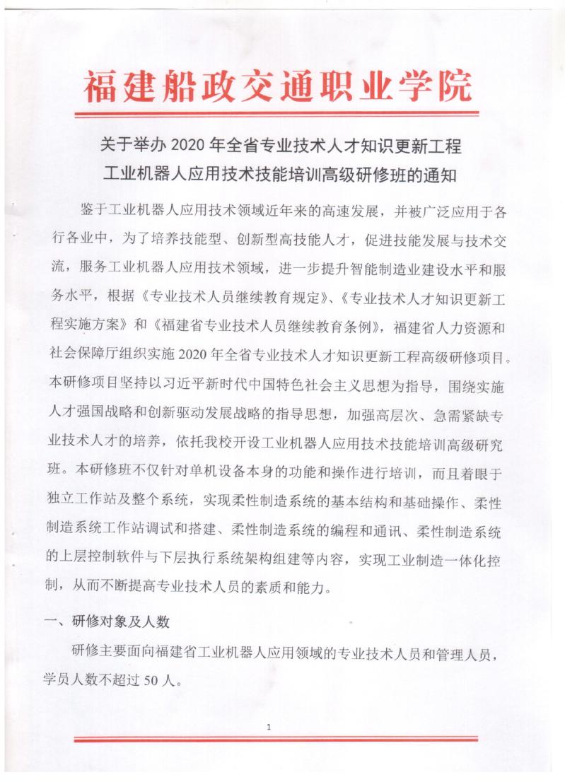 關于舉辦2020年全省專業(yè)技術人才知識更新工程工業(yè)機器人應用技術技能培訓高級研修班的通知