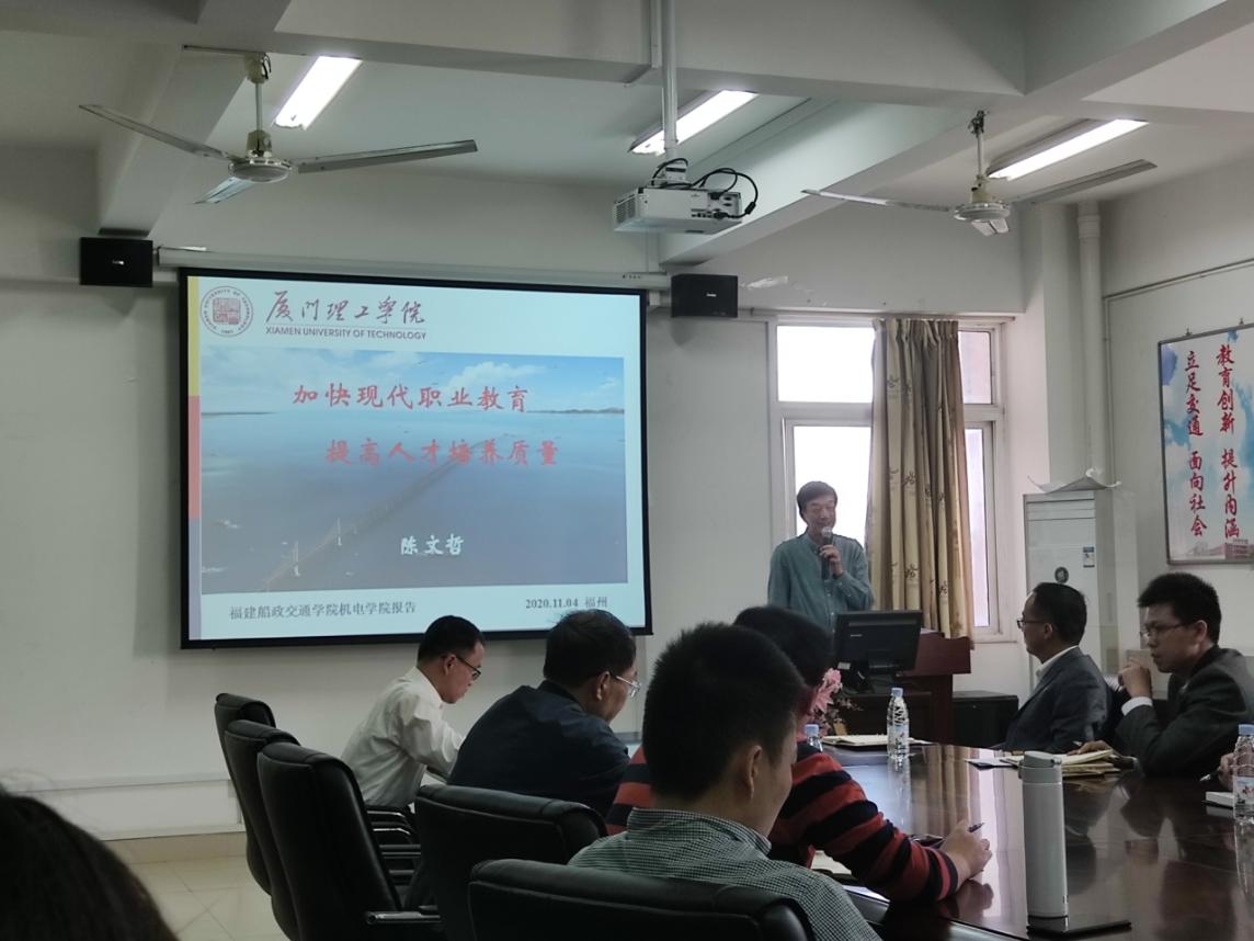 今年全國(guó)職業(yè)教育宣傳周活動(dòng)的主題是“技能人才展時(shí)代風(fēng)采,職教奮進(jìn)慶祖國(guó)華誕”。為積極響應(yīng)全國(guó)職業(yè)教育宣傳周的號(hào)召,營(yíng)造濃厚的職業(yè)宣傳氛圍,提高社會(huì)各界對(duì)職業(yè)教育的認(rèn)可度,進(jìn)一步深化職業(yè)教育教學(xué)改革,推進(jìn)現(xiàn)代職業(yè)教育,提高教學(xué)質(zhì)量,切實(shí)加強(qiáng)技能型人才的培養(yǎng),11月3日下午,我院邀請(qǐng)?jiān)瓘B門理工學(xué)院校長(zhǎng)陳文哲教授作《加快現(xiàn)代職業(yè)教育 提高人才培養(yǎng)質(zhì)量》專題講座。機(jī)械學(xué)院全體教職工參會(huì)聽(tīng)講,報(bào)告會(huì)由機(jī)械學(xué)院院長(zhǎng)楊開(kāi)懷博士主持。