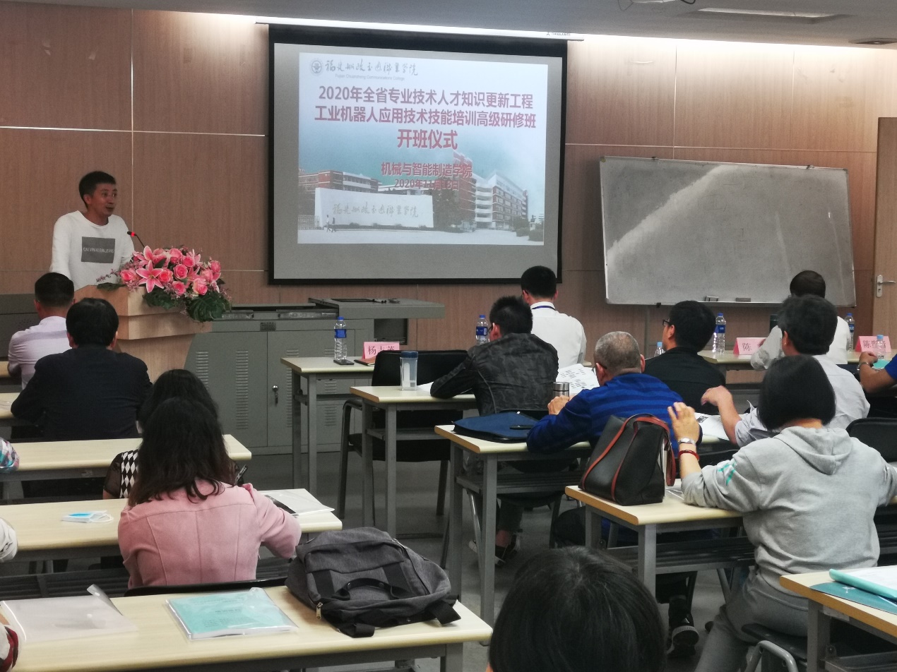 楊開懷院長(zhǎng)首先對(duì)參加開班儀式的領(lǐng)導(dǎo)和嘉賓表示歡迎,對(duì)給予此次培訓(xùn)技術(shù)支持的福建閩大科技有限公司表示感謝。接著介紹了機(jī)械與智能制造學(xué)院工業(yè)機(jī)器人專業(yè)的歷史沿革,以及工業(yè)機(jī)器人應(yīng)用技術(shù)領(lǐng)域近年來的發(fā)展前景,我院在工業(yè)機(jī)器人專業(yè)課程優(yōu)化、實(shí)驗(yàn)室建設(shè)、技能競(jìng)賽等方面取得的優(yōu)異成績(jī),并努力致力于為我省乃至全國(guó)的工業(yè)機(jī)器人行業(yè)培養(yǎng)高素質(zhì)技能人才。